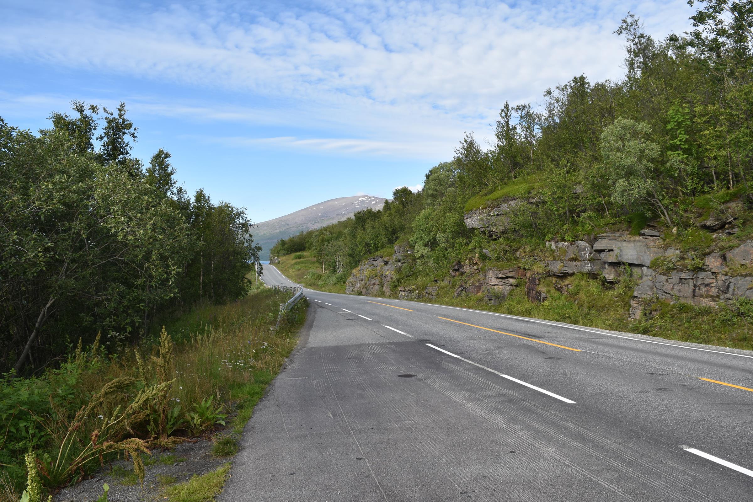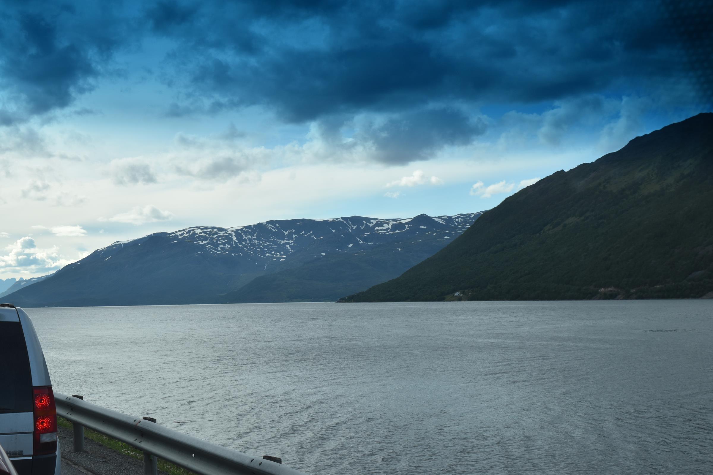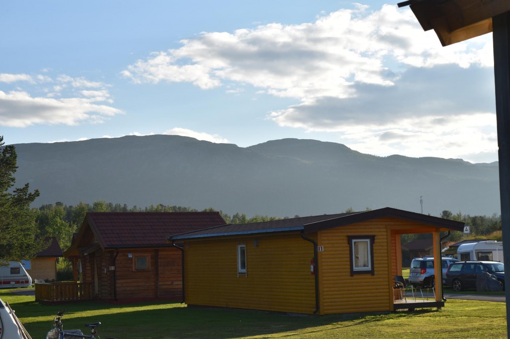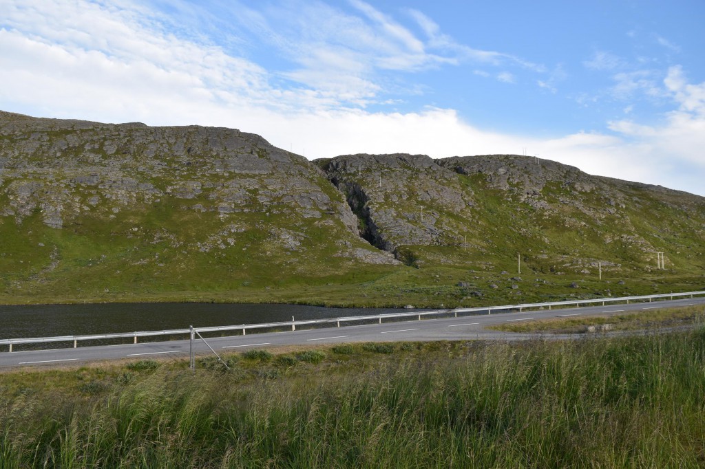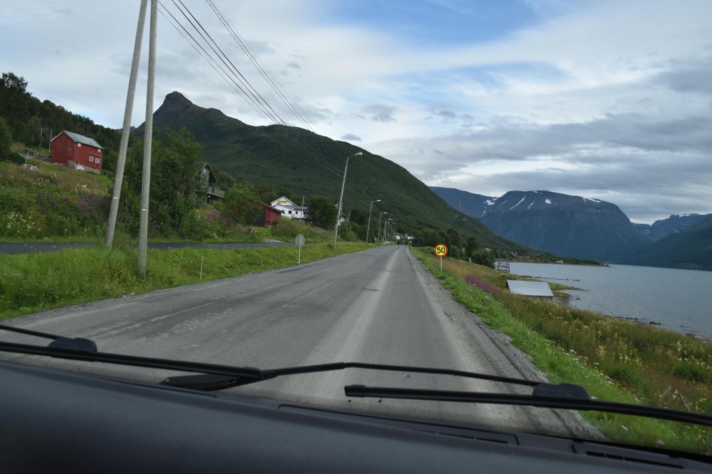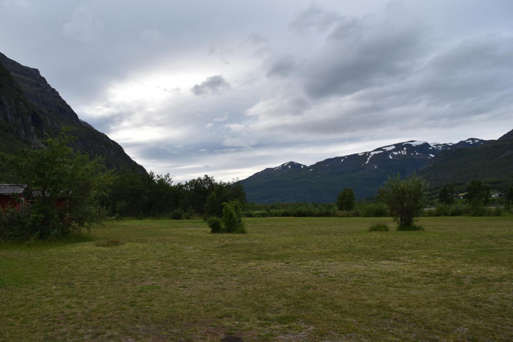 Und so war es nach einem fast 60-minütigen Telefonat mit Mama (man kann ja doch eine Menge erzählen…) auch schon halb drei bis ich überhaupt vom Campingplatz fuhr und mich auf den Weg entlang der Fjordküste weiter in Richtung Südwesten begab. Auf der E6, welche die Hauptverkehrsstraße in Richtung Nordkap und russische Grenze ist, blieb ich dann für etwa 100km bis mir die Gegend ganz gut gefiel und ich mich entschloss für die Nacht zu bleiben.