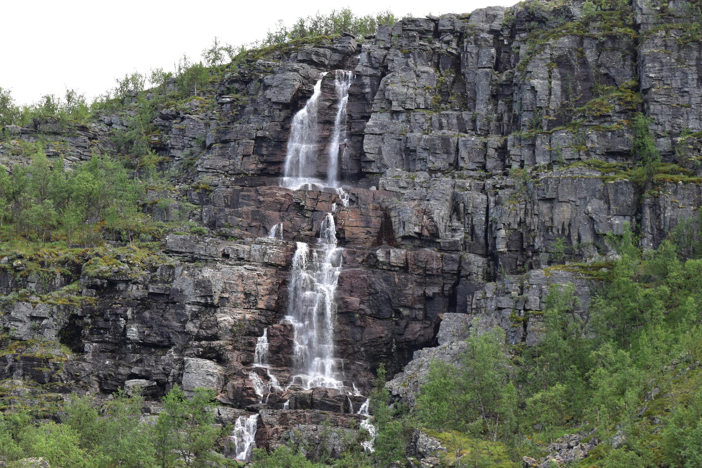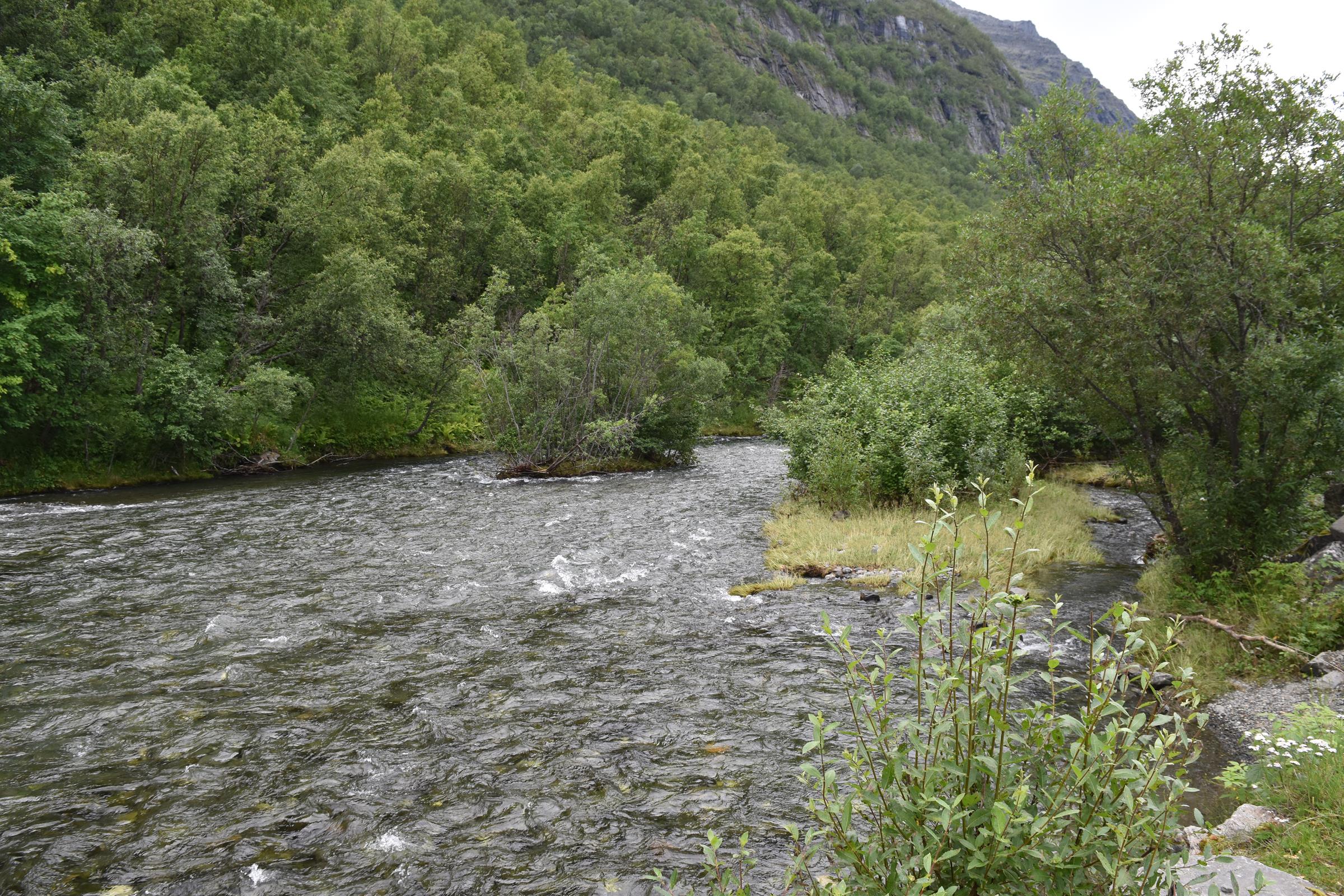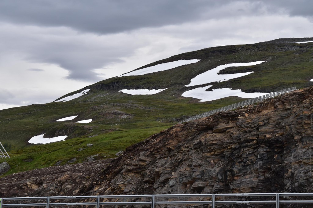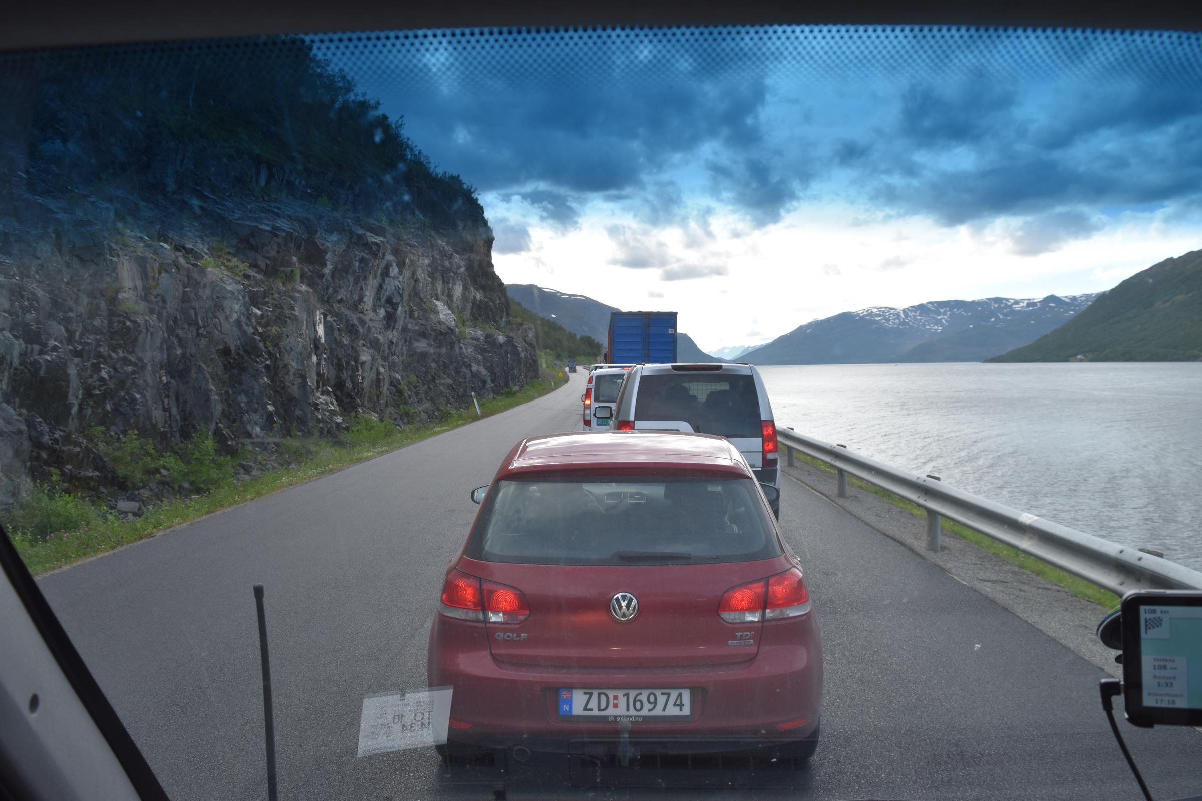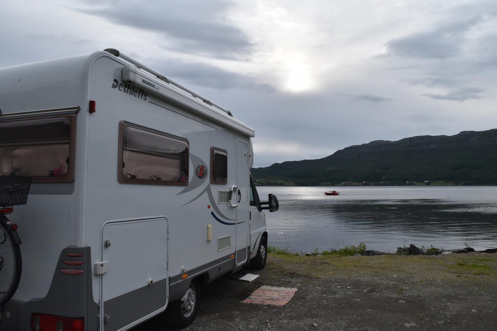 Und so war es nach einem fast 60-minütigen Telefonat mit Mama (man kann ja doch eine Menge erzählen…) auch schon halb drei bis ich überhaupt vom Campingplatz fuhr und mich auf den Weg entlang der Fjordküste weiter in Richtung Südwesten begab. Auf der E6, welche die Hauptverkehrsstraße in Richtung Nordkap und russische Grenze ist, blieb ich dann für etwa 100km bis mir die Gegend ganz gut gefiel und ich mich entschloss für die Nacht zu bleiben.
